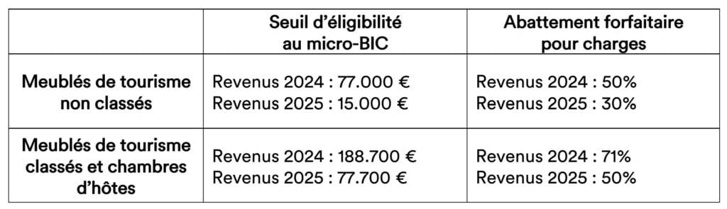 A noter : le seuil de chiffre d’affaires et l’abattement du régime des meublés de tourisme classés (CA HT de 77.000 € / abattement de 50%) sont désormais les mêmes que ceux du micro-BIC applicable aux locations meublées de longue durée (résidence principale du locataire).